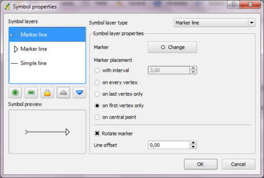 Using ‘Marker Placement’ options in ‘Marker Line’, we can now create fancy arrows pointing in or against line direction.