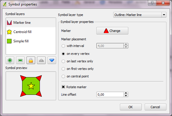 Besides normal and SVG polygon fill styles, new symbology now offers centroid and outline styles. Outline styles offer all options found in line style dialog (simple, marker and line decoration).