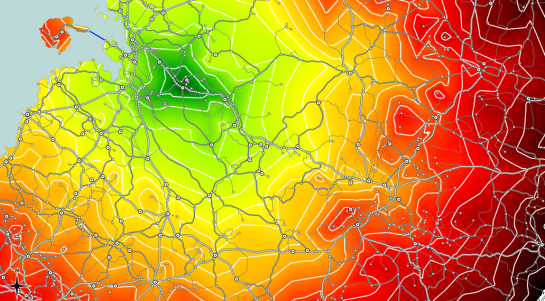 Then, I loaded the point table into QGIS and calculated a TIN based on the cost attribute. With “Contour” from GdalTools, you can visualize equal-cost areas even better:
