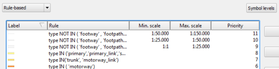 I’ve excluded a number of road types from being rendered and labeled. This is done by NOT specifying a rule that fits those classes. That’s the reason why I don’t have a “no filter” rule. Instead, I’ve specified