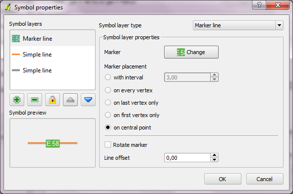 For now, one possible solution for this is to create the shields using the “Marker lines” feature of new symbology. As the name suggests, you can put markers on lines. In this case, the marker will be our road shield. It basically has two parts: the colored shield plus the text. The shield can be created by putting two squares besides each other. (Adjust the offsets to move them besides each other.) Then we can put the text on top, one letter at a time.