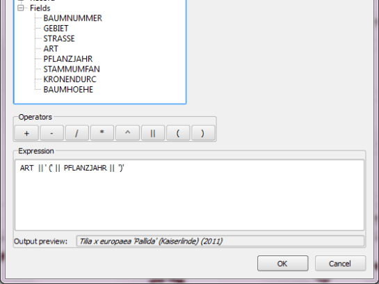 QGIS new labeling dialog is extended by a new expression builder that facilitates building your own expressions using layer attributes together with various functions for data manipulation: