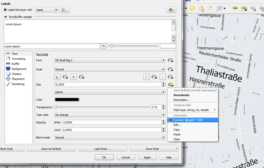 Since OSM data is in WGS84 by default, street length will be measured in degrees and therefore the values will be small. To get to a reasonable font size, I selected $length * 1000.