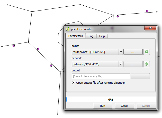 The interface of the points_to_route tool is very simple. All it needs as an input is information about which layer should be used as a network and which layer contains the route points:
