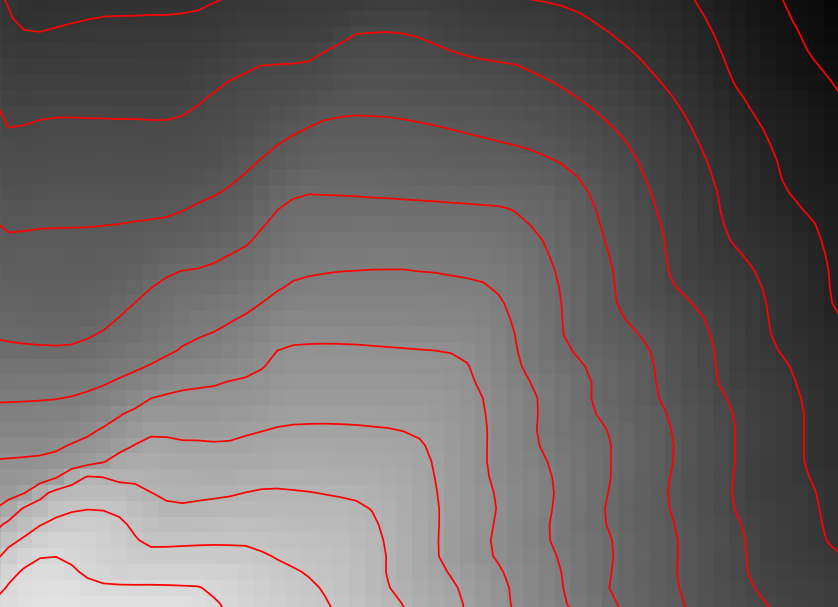 On the first look it is beautiful but… It is dependent on the contour starting and ending point and if you have more mountains and up and downs it ends up with making lighter contours on downhills and dark on uphills. All is needed is the azimuth actually needs to be calculated from slope direction, not from contour direction.