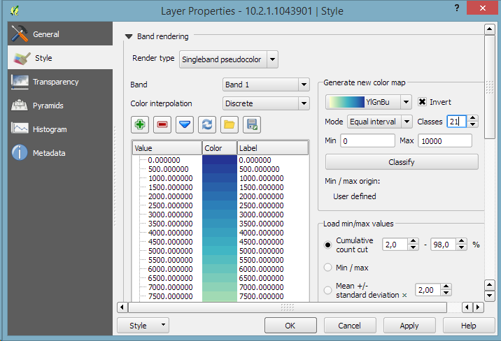 The final step, to get as close to the original design as possible, is to create the effect of discrete elevation classes instead of a smooth color gradient. This can easily be achieved by changing the color interpolation mode of the DEM from Linear to Discrete: