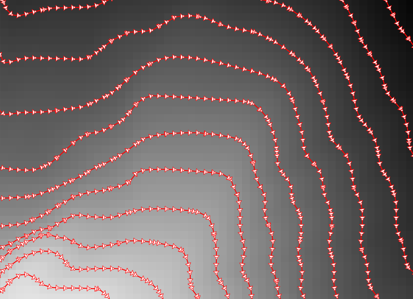 When we split the contours and visualize the result using arrows, we can see that they all wrap around the mountain in clockwise direction (light DEM cells equal higher elevation):