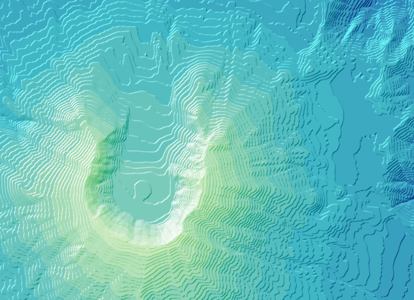 – colour on the contour lines represents both slope AND aspect. For example lines on the right side of the cone are white because they are perpendicular to the sun and because their aspect is between 270 and 360 degrees, that is, they slope TOWARD the sun; lines in the lower right side of the image that are also perpendicular to the sun are dark because their aspect is between 90 and 180 degrees, that is because they slope AWAY FROM the sun. Is this correct?