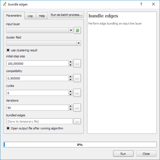 Surprisingly, edge bundling is not available in desktop GIS. Existing implementations in the visual analytics field often run on GPUs because edge bundling is computationally expensive. Nonetheless, we have set out to implement force-directed edge bundling for the QGIS Processing toolbox [0]. The resulting scripts are available on Github.
