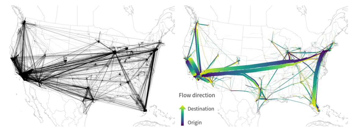 To avoid overlaps of flows in opposing directions, we define a line offset. Finally, summarize also adds a sequence number to the line segments. This sequence number is used to assign a line color on the gradient that indicates flow direction.