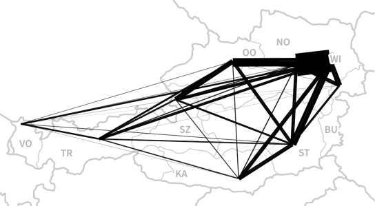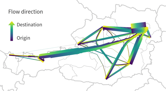 If you follow this blog, you’ll probably remember that I published a QGIS style for flow maps a while ago. The example showed domestic migration between the nine Austrian states, a rather small dataset. Even so, it required some manual tweaking to make the flow map readable. Even with only 72 edges, the map quickly gets messy: