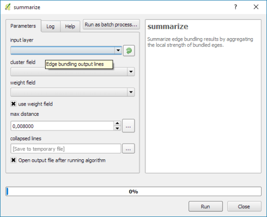 After this edge bundling step, most common implementations compute a line heatmap, that is, for each map pixel, determine the number of lines passing through the pixel. But QGIS does not support line heatmaps and this approach also has issues distinguishing lines that run in opposite directions. We have therefore implemented a summarize tool that computes the local strength of the generated bundles.