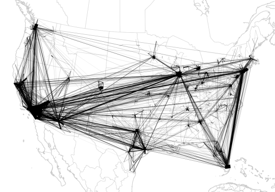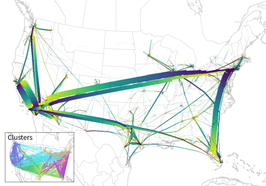 In this example, we divided the edges into six clusters before bundling them. If you compare this result to the visualization at the top of this post (which did not use clustering), you’ll see some differences here and there but, overall, the results are quite similar: