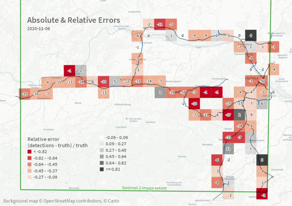 Thanks to the truck reference locations provided by ASFINAG, we were also able to analyze the spatial distribution of truck detections. We decided to compare ASFINAG data (truth) and Sentinel-2-based detections using a grid based approach with a cell size of 5×5 km. Confirming Henrik’s original results, grid cells with higher detection than ground truth values are clearly in the minority. Interestingly, many cells in Vienna (at the eastern border of the image extent) exhibit rather low relative errors compared to, for example, the cells along Westautobahn (the east-west running autobahn in the center of the image extent).