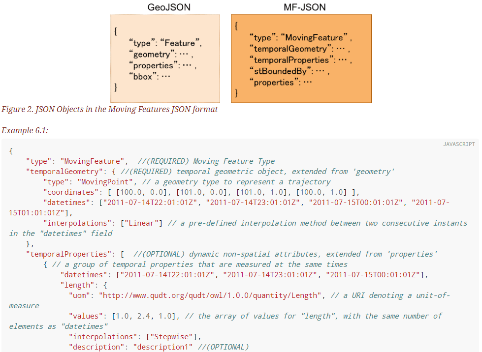 Basically Moving Features JSON (MF-JSON) is heavily inspired by GeoJSON and it comes with a bunch of mandatory and optional key/value pairs. There is support for static properties as well as dynamic temporal properties and, of course, temporal geometries (yes geometries, not just points).