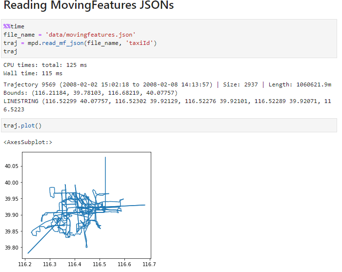 Inspired by Pandas.read_csv() and GeoPandas.read_file(), I’ve started implementing a read_mf_json() function in MovingPandas. So far, it supports basic MovingFeature JSONs with MovingPoint geometry: