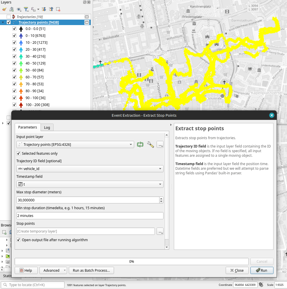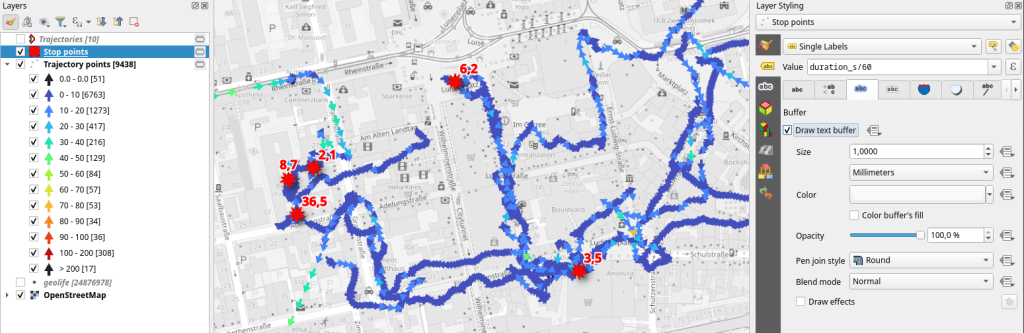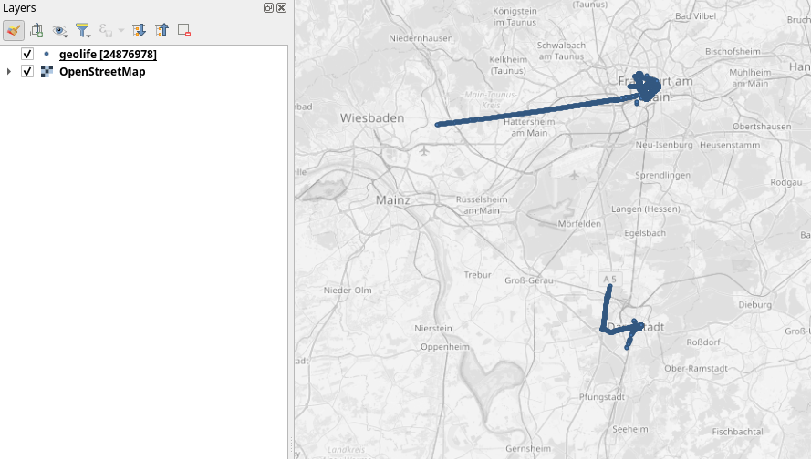 When we zoom in to Darmstadt and enable the trajectories layer, we can see each individual trip. Looks like car trips on the highway and walks through the city: