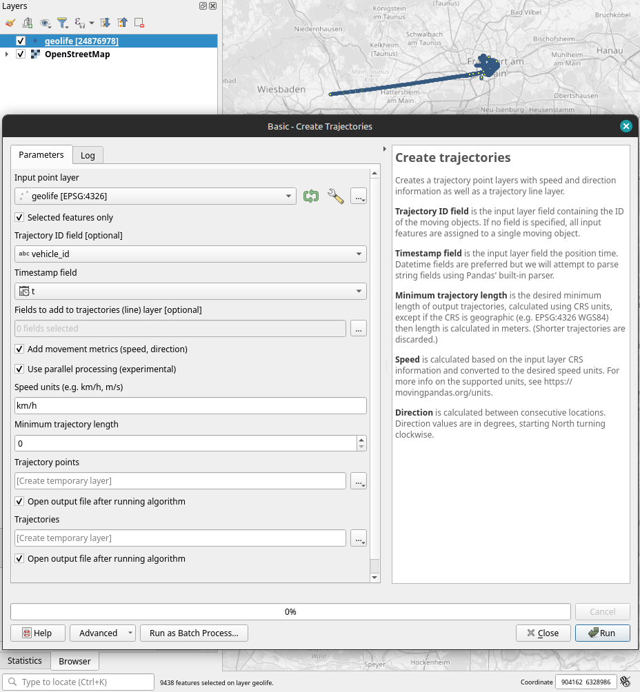 Selecting the 9,438 points in this extent, let’s compute movement metrics (speed & direction) and create trajectory lines: