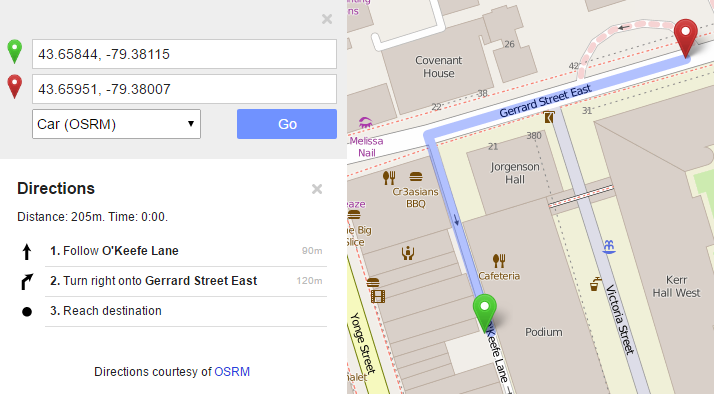 This work has been in the making for a while. I’d like to thank the team of OpenRouteService.org who’s routing service I used (and who recently added support for North America) as well as my colleagues at Ryerson University in Toronto, who pointed me towards Toronto’s open data.