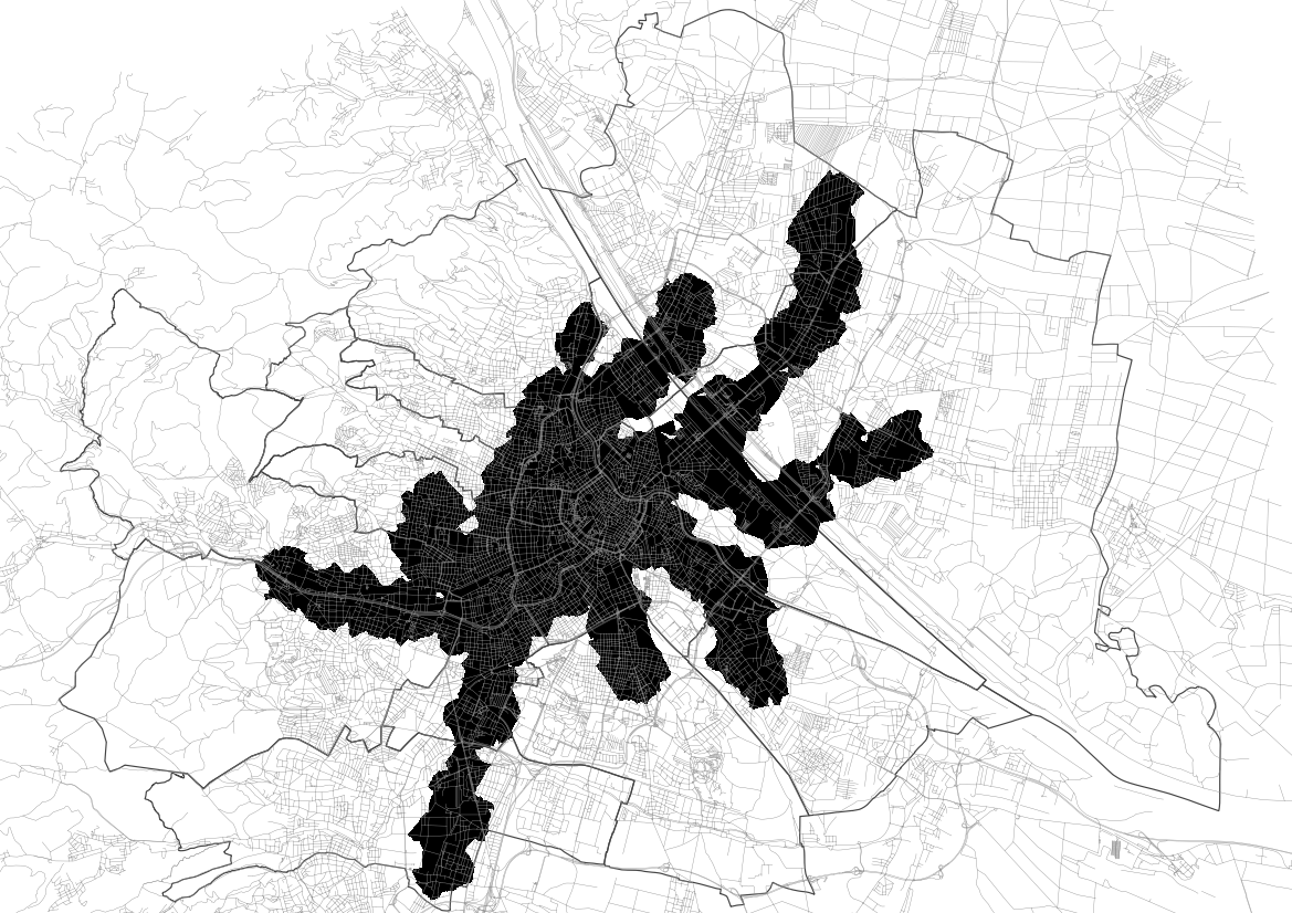 Zoomed in, more labels will be displayed and an additional layer with metro stations becomes visible. The metro symbol was created using the same technique described for the road shields.