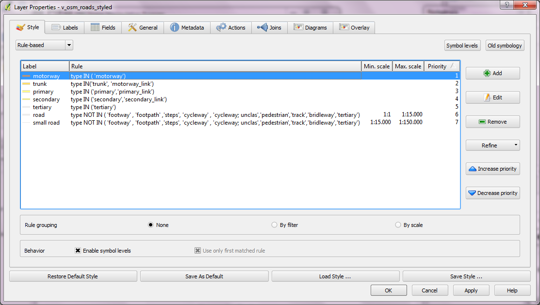 I’ve excluded a number of road types from being rendered and labeled. This is done by NOT specifying a rule that fits those classes. That’s the reason why I don’t have a “no filter” rule. Instead, I’ve specified