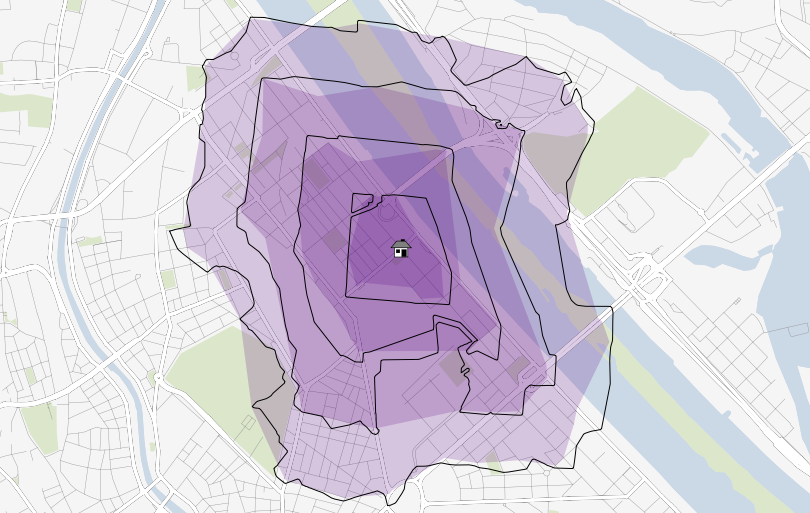 While this approach certainly has it’s limitations, it’s a good place to start learning how to create isochrones. A better solution should take into account that it takes time to change between different lines. While preparing the network, more care should to be taken to ensure that possible exchange nodes are modeled correctly. Some network links might only be usable in one direction. Not to mention that there are time tables which could be accounted for ;)