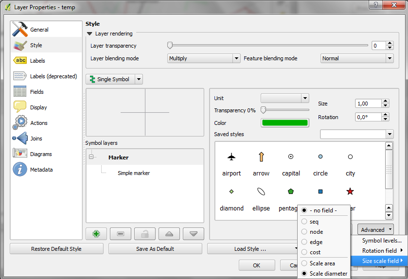 1. We want to scale the circle radius to reflect the remaining time left to walk. Therefore, enable Scale diameter in Advanced | Size scale field: