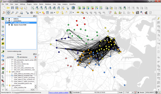 For a first impression, I decided to map popular connections with more than one hundred entries. Wider lines mean more entries. The points show the station locations and they are color coded by starting letter. (I’m not yet sure if they mean anything. They seem to form groups.)