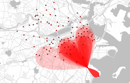 The ideas was to add a notion of direction as well as uncertainty. The “flower petals” have a pointed origin and grow wider towards the middle. (Looking at the final result, they should probably go much narrower towards the end again.) The area covered by the petals is a simple approximation of where I’d expect the bike routes without performing any routing.