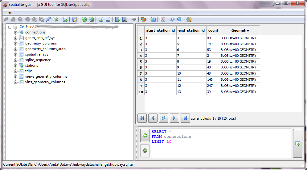 To get started, I loaded both station Shapefile and trip CSV into a new Spatialite database. The GUI is really helpful here – everything is done in a few clicks. Afterwards, I decided to look into which station combinations are most popular. The following SQL script creates my connections table: