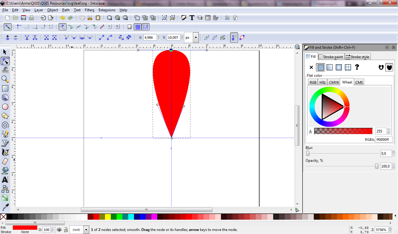 For the style, I created a new “flower petal” SVG symbol in Inkscape and styled it with varying transparency values: Rare connections are more transparent than popular ones. This style is applied to the connection start points. Using the advanced options “size scale” and “rotation”, it is possible to rotate the petals into the right direction as well as scale them using the previously calculated values for connection length and orientation.