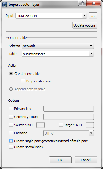 In this example, I renamed “gid” to “id”, but you can actually edit the values in the drop down boxes to adjust the column names for id and geometry: