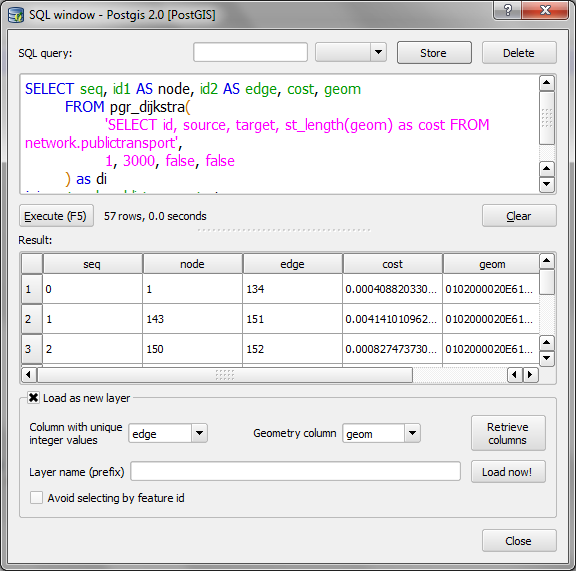SELECT seq, id1 AS node, id2 AS edge, cost, geom