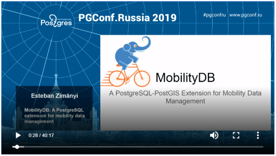 • Zimányi, E., Sakr, M., Lesuisse, A., & Bakli, M. (2019). MobilityDB: A Mainstream Moving Object Database System. In Proceedings of the 16th International Symposium on Spatial and Temporal Databases (pp. 206-209). ACM.