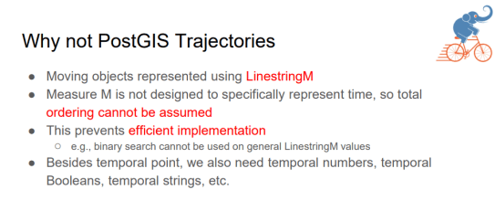 It will be interesting to see if MobilityDB will be able to achieve the goal they have set in the title of Zimányi et al. (2019) to become “a mainstream moving object database system”. It’s promising that they are building on PostGIS and using its mature spatial analysis functionality instead of reinventing the wheel. They also discuss why they decided that PostGIS trajectories (which I’ve written about in previous posts) are not the way to go: