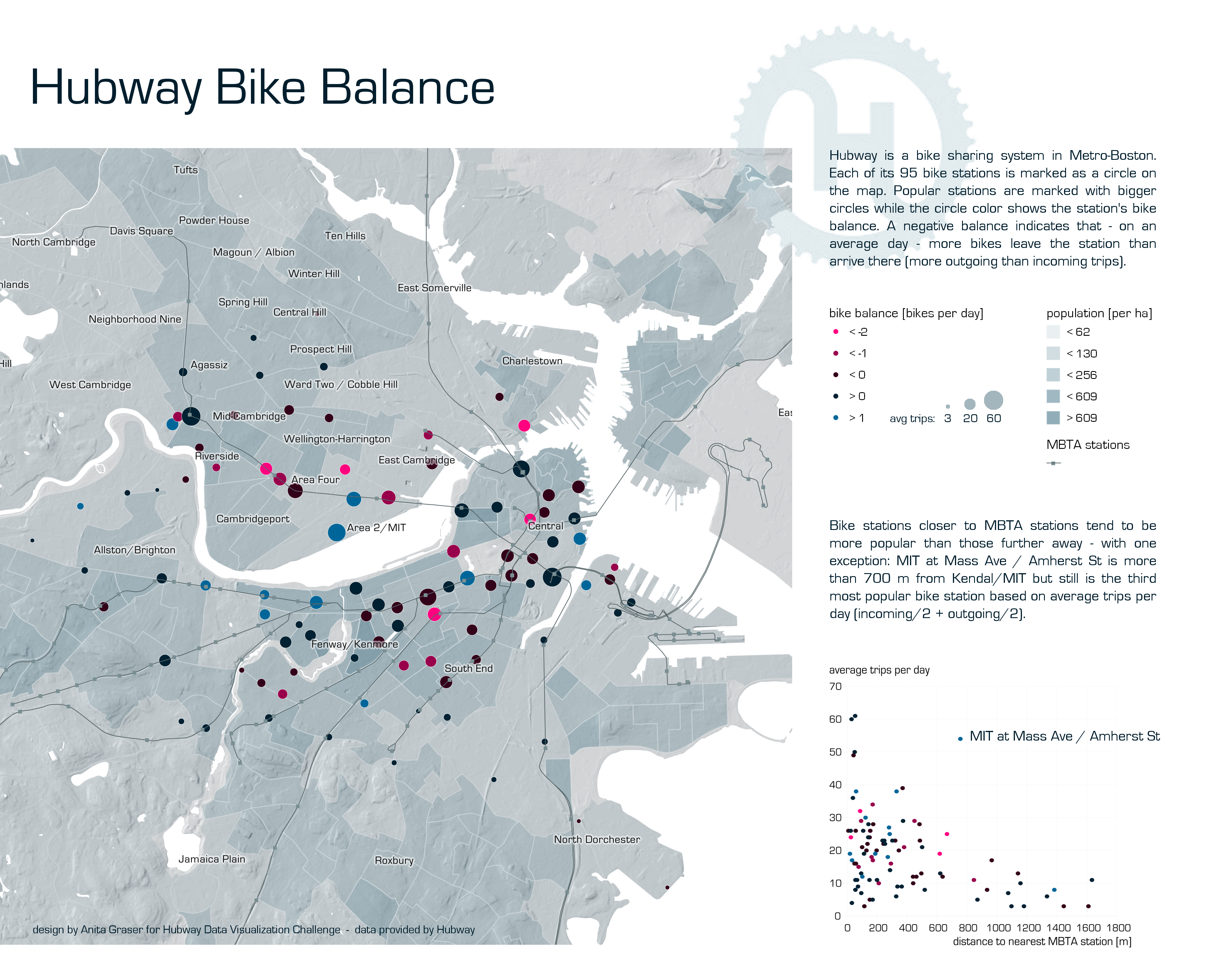 Hubway Bike Balance presents different aspects of bike station popularity. It shows which stations service most trips and how balanced incoming and outgoing trips were over the last months. Another aspect I explored is the correlation between closeness to public transport (MBTA stations) and bike station popularity.