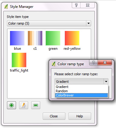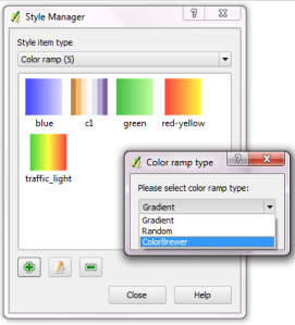 When creating a new color ramp, you get to choose between “Gradient”, “Random” and finally “ColorBrewer” ramp type. (By the way: You can create multi-color color ramps if you choose “Gradient”.)