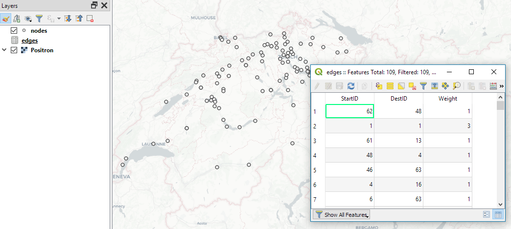 The first step therefore is to create the flow line features from the nodes and edges layers. To achieve our goal, we need to join both layers. Sounds like a job for SQL!