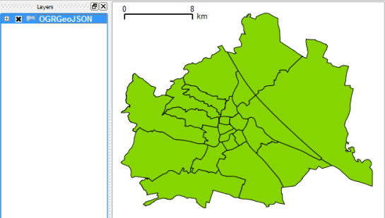 Let’s see how we can use the data available through their WFS using the district information layer “Bezirksgrenzen” as an example. The page lists a GML and a GeoJSON version of WFS. For now, we’ll use GeoJSON.