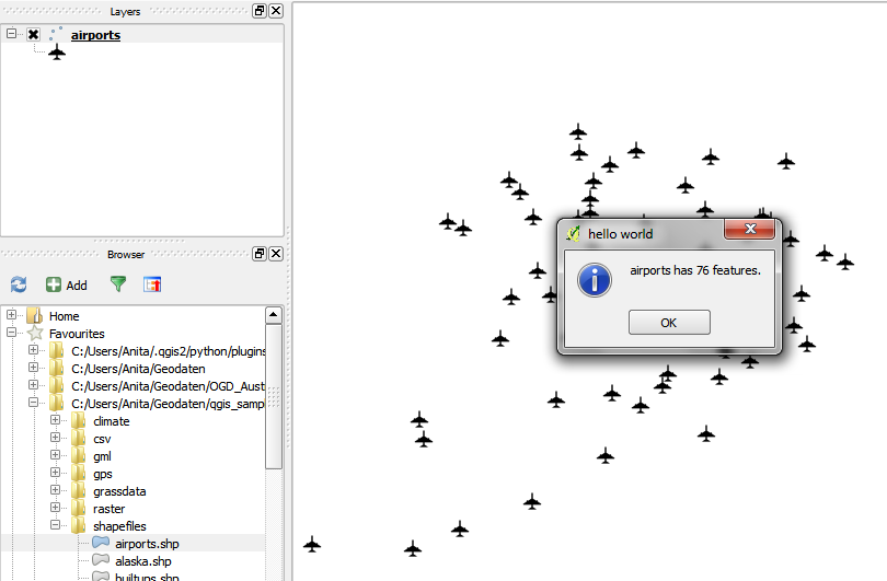 When you are done with the code, you can use Plugin Reloader to load the new version. When you start the plugin now, the combobox will be populated with the names of the vector layers in your current project. And on pressing Ok, the plugin will compute and display the number of features.