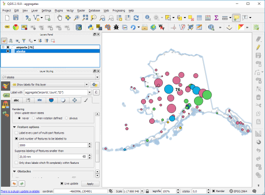 At this point, we have 72 flow features and 9 state polygon features. An ordinary join in the layer properties won’t do the trick. We’d still be stuck with only 9 polygons.