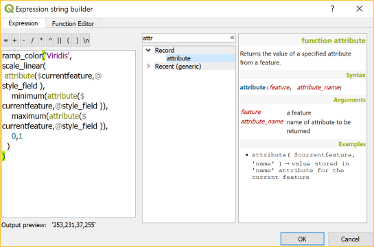 We configure the symbol of the first rule to visualize the flow strength. The color represents the number number of people moving to the respective district. I’ve decided to use a smooth gradient instead of predefined classes for the polygon fill colors. The following expression maps the feature’s weight value to a shade on the Viridis color ramp: