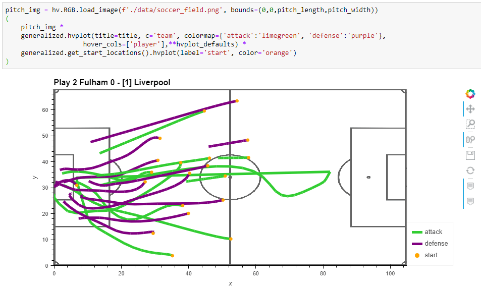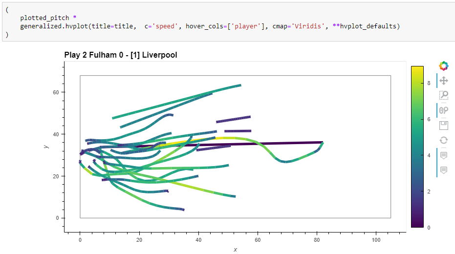 Since Geopandas and GeoViews support handling and plotting local coordinates just fine, there is nothing stopping us from applying all MovingPandas functionality to this data. For example, to visualize the movement speed of players: