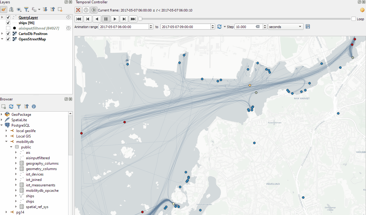 Since our filtered AIS layer has proper timestamps, we can animate it using the Temporal Controller. This enables us to replay the movement and see what was going on in a certain time frame.