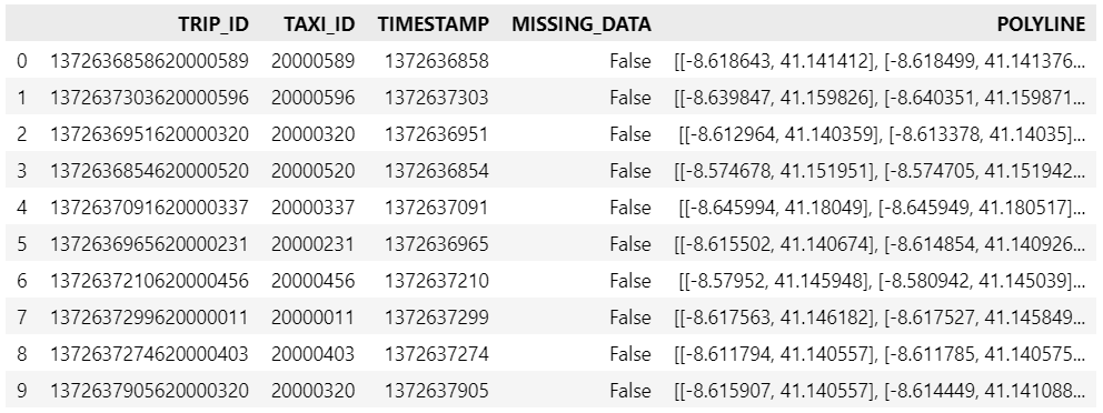 df = pd.read_csv(input_file_path, nrows=10, usecols=['TRIP_ID', 'TAXI_ID', 'TIMESTAMP', 'MISSING_DATA', 'POLYLINE'])