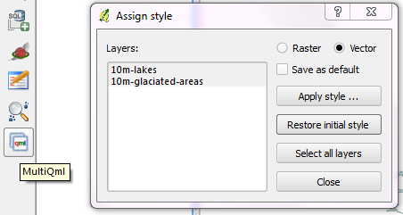 With MultiQML, you can apply a style to multiple raster or vector layers: First, select the layers you want to style (use shift/ctrl to select multiple layers), press “Apply style …” button and select the appropriate QML. That’s it!