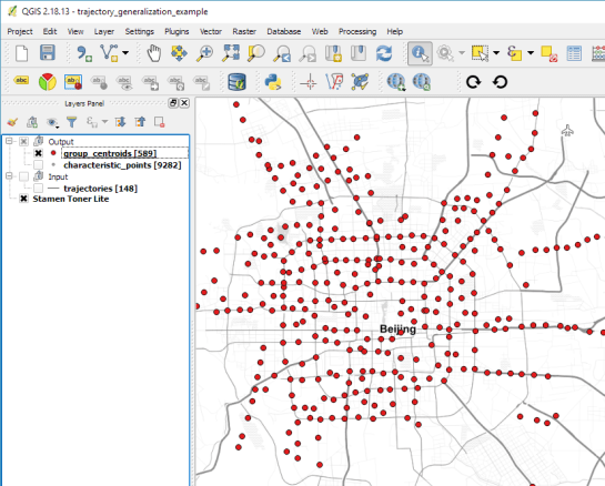 The main procedure consists of two tools: bundle edges and summarize. Bundle edges takes the raw straight lines, and incrementally adds intermediate nodes (called control points) and shifts them according to computed spring and electrostatic forces. If the input are 72 lines, the output again are 72 lines but each line geometry has been bent so that similar lines overlap and form a bundle.